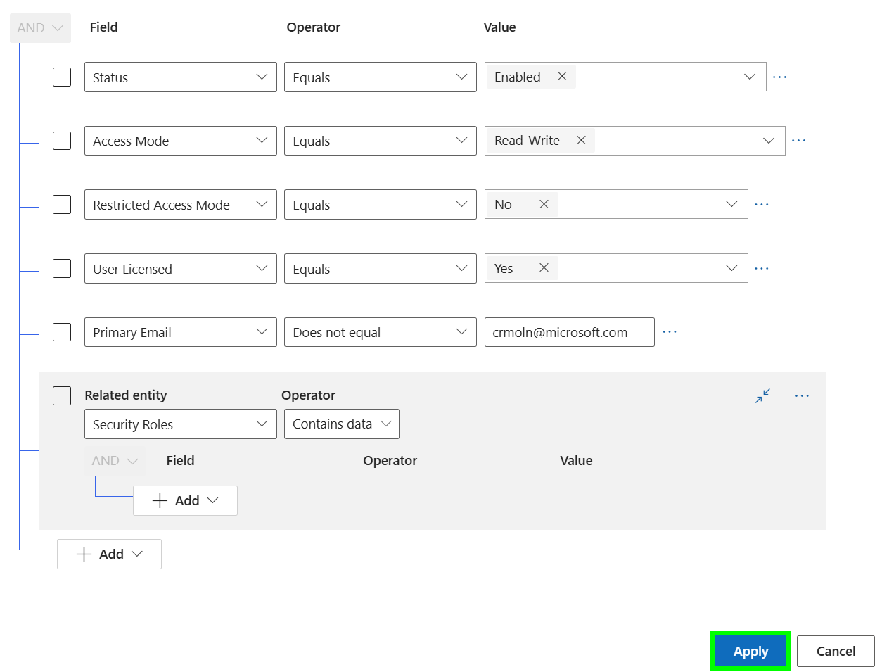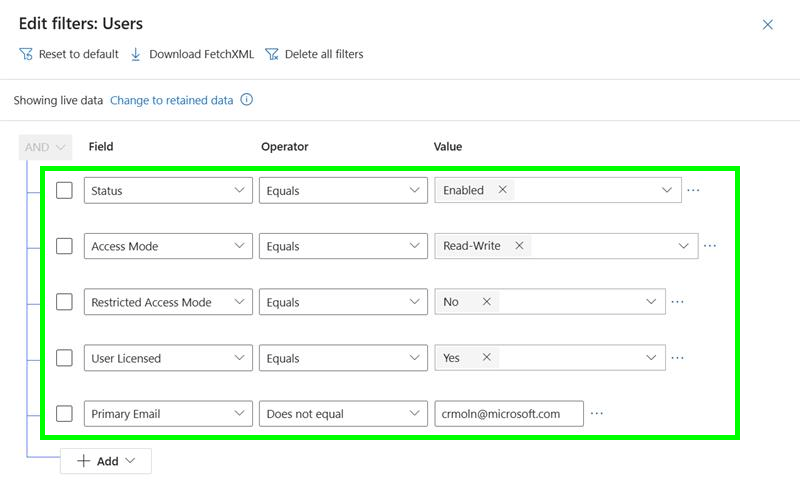 e. **Primary Email address** Does not Equal **<crmoln2@microsoft.com>**