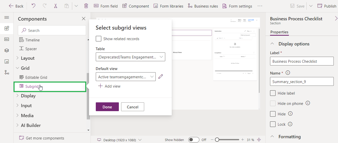This will open 'Select subgrid views' form, where you need to fill in the details.