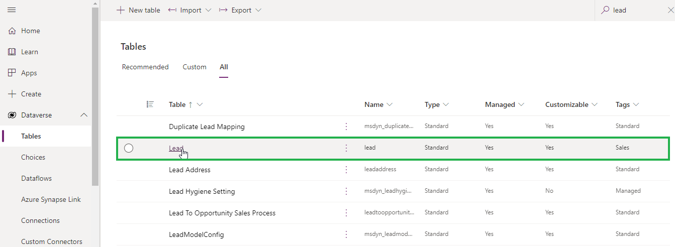 Navigate to Dataverse --> Tables.