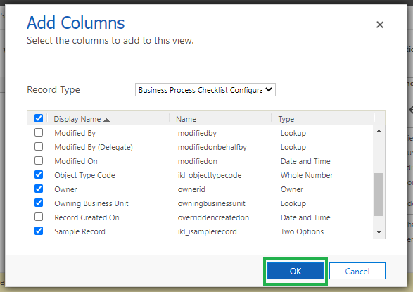 * You can keep the following column names disabled -  **Created by, Created by (Delegate), Created on, Modified by, Modified by (Delegate), Modified on and Record created on.**