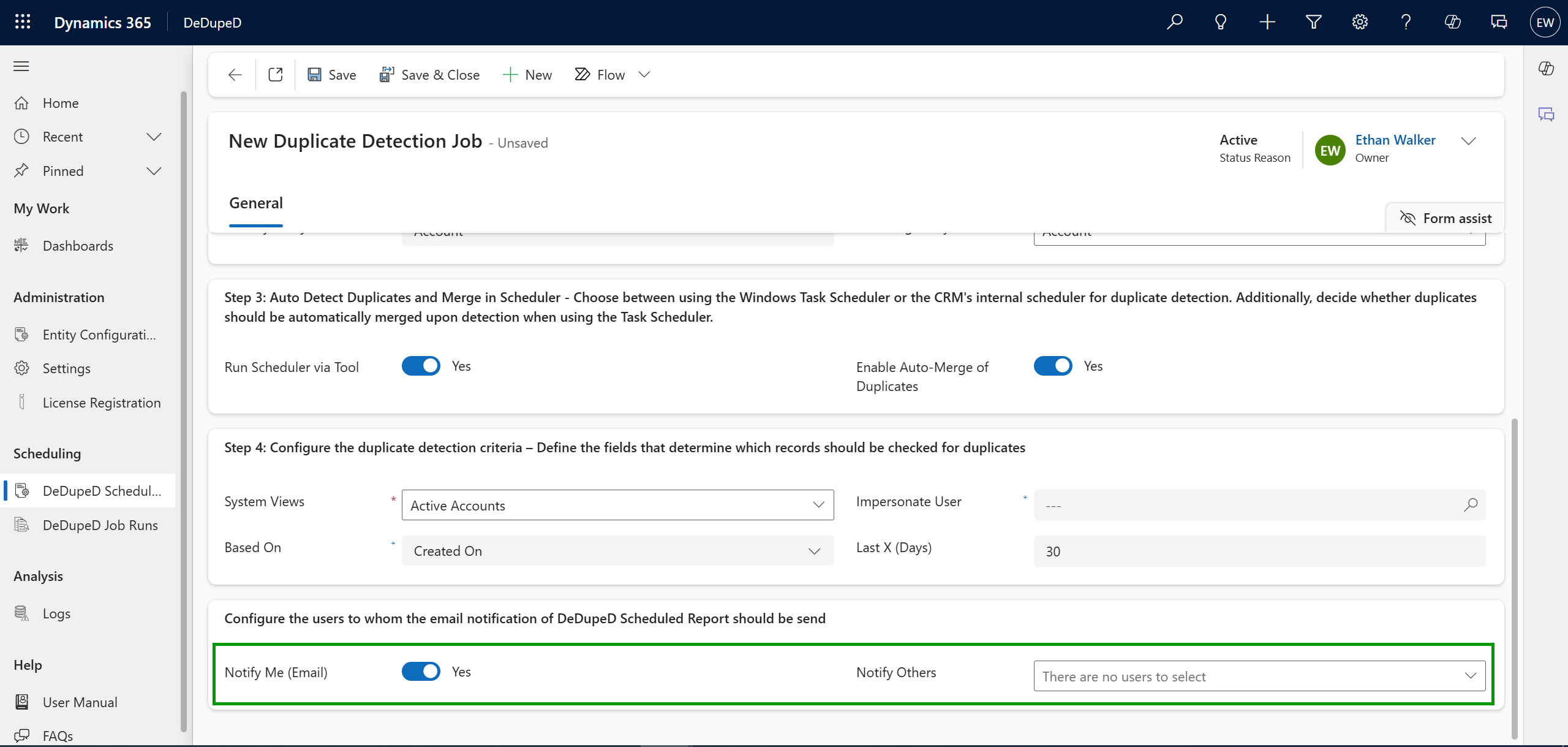 * Change the toggle state to Yes to choose the Task scheduler for duplicate detection (If not enabled, the CRM's internal scheduler is utilized for duplicate detection)