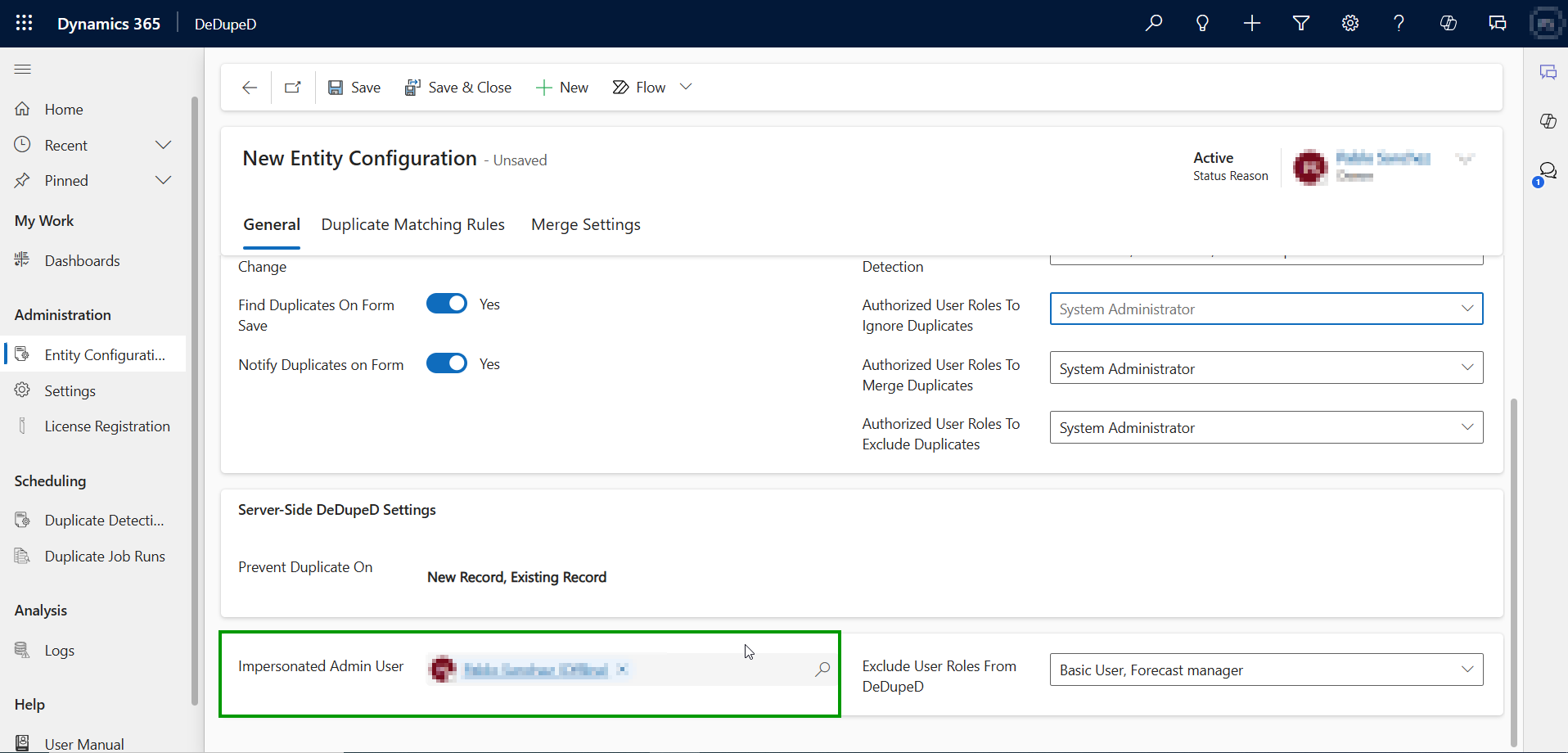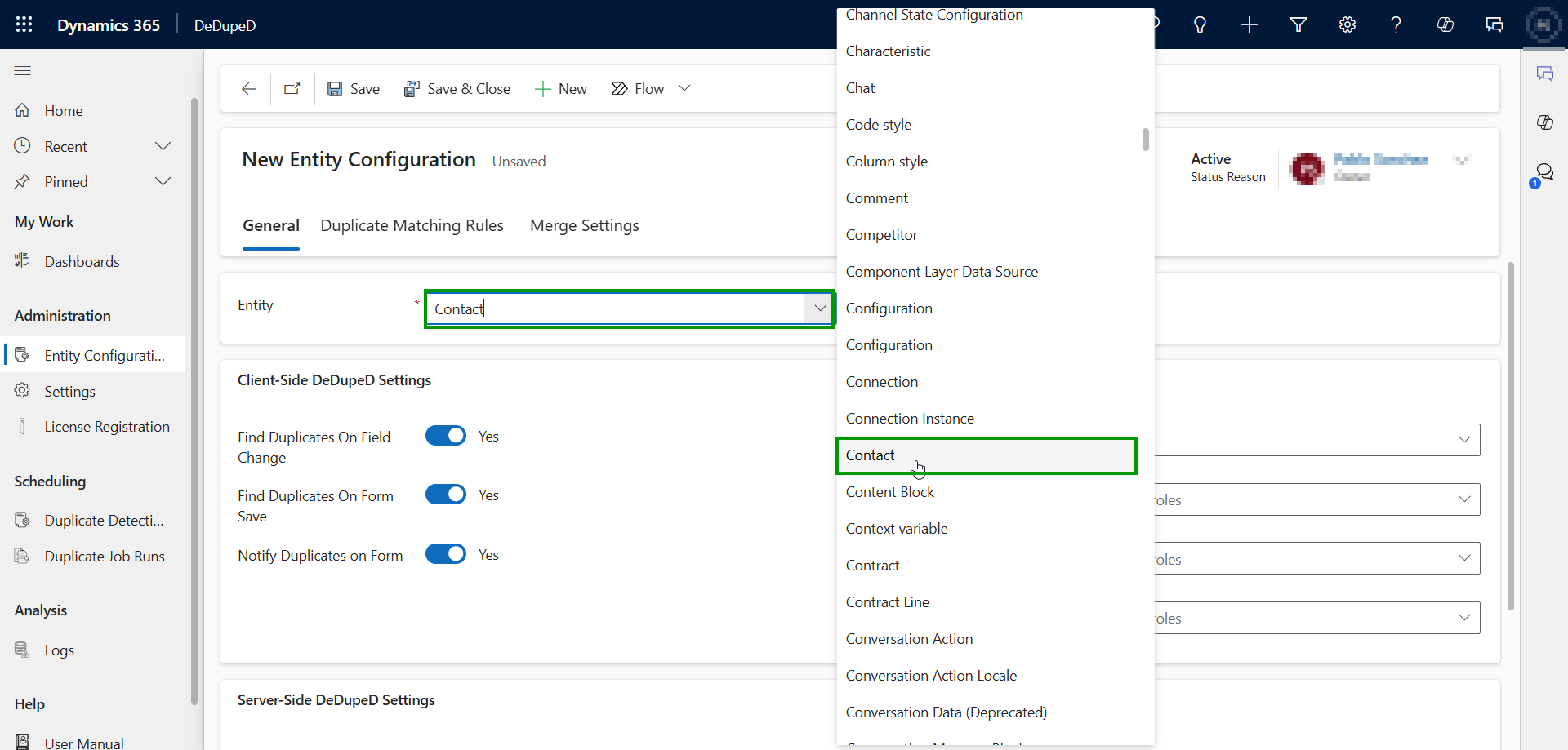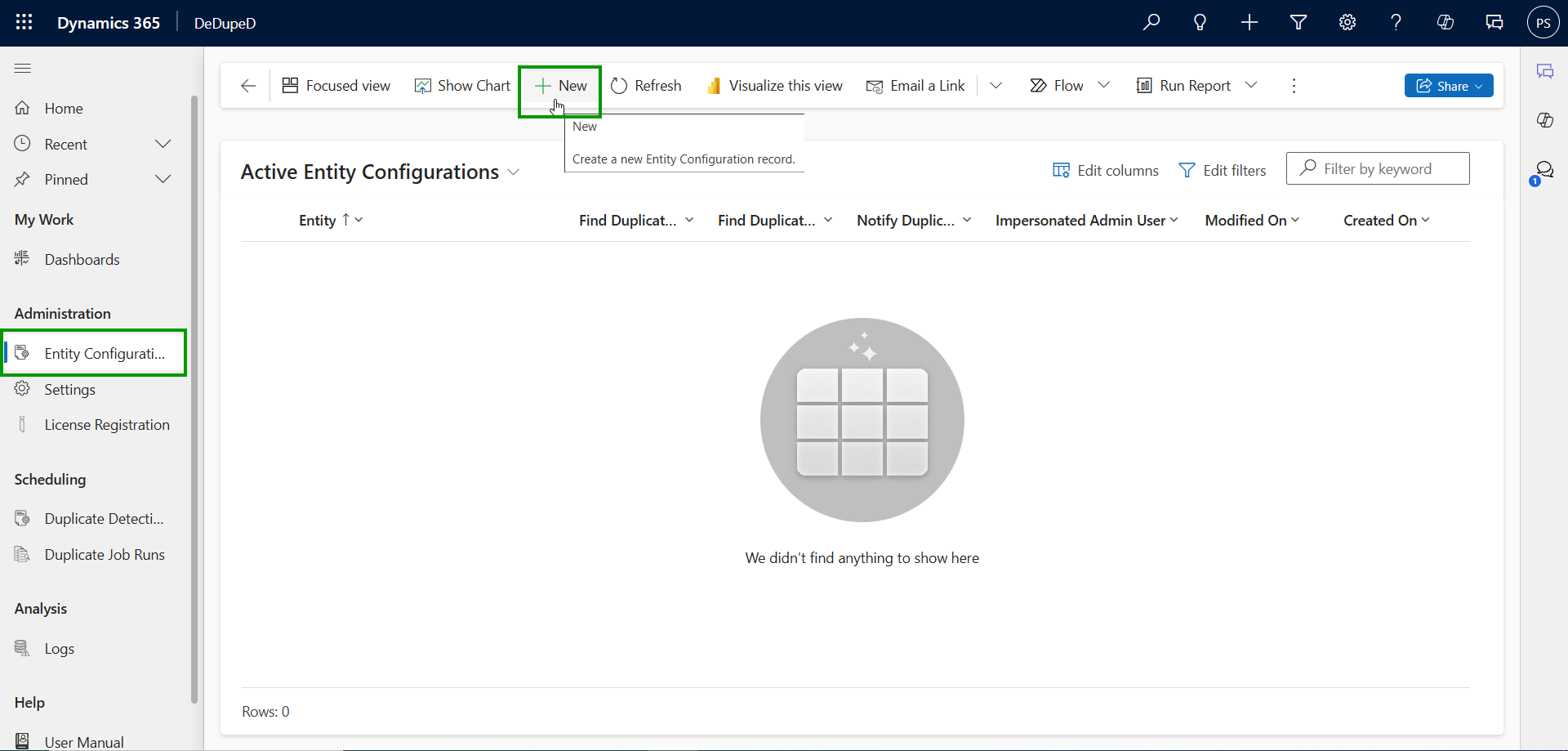 * Navigate to **DeDupeD App --> Entity Configuration --> Click** on **‘New’.**
