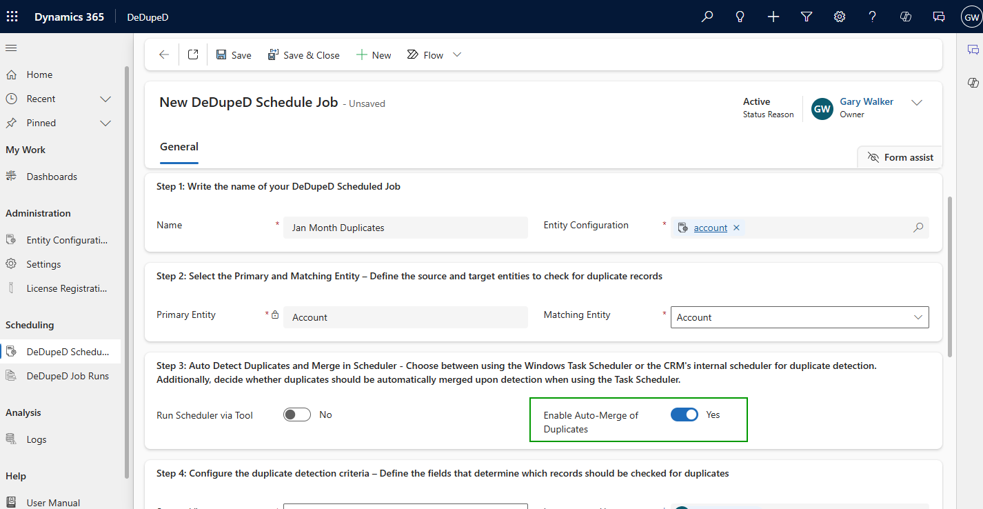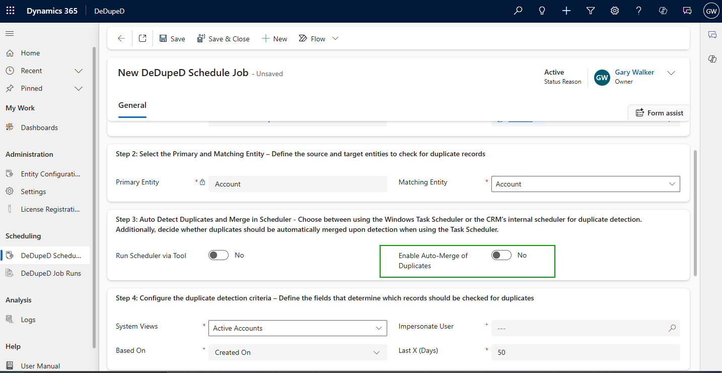 This makes DeDupeD execute duplicate detection and merging automatically on that schedule.