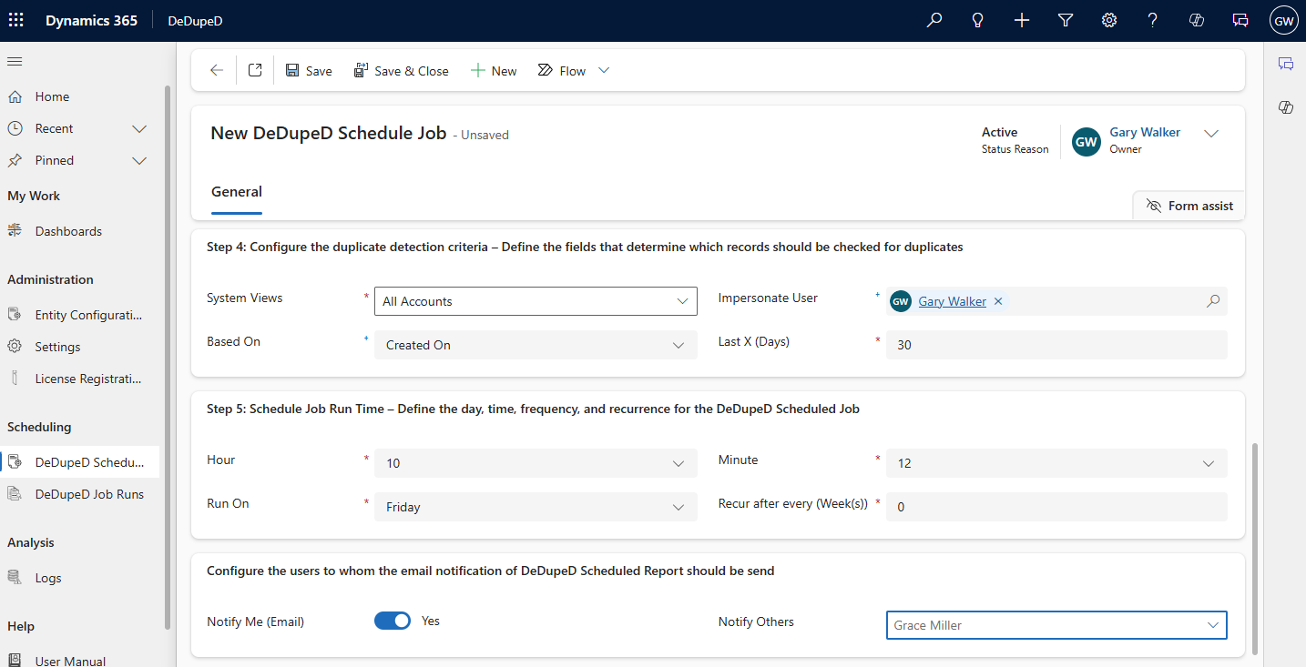 With the DeDupeD app, you can schedule duplicate detection jobs to run and automatically detect duplicates on a daily, weekly, or monthly basis. As well as send the duplicate detection report link consisting of all the fetched duplicate records to the desired CRM users via mail.