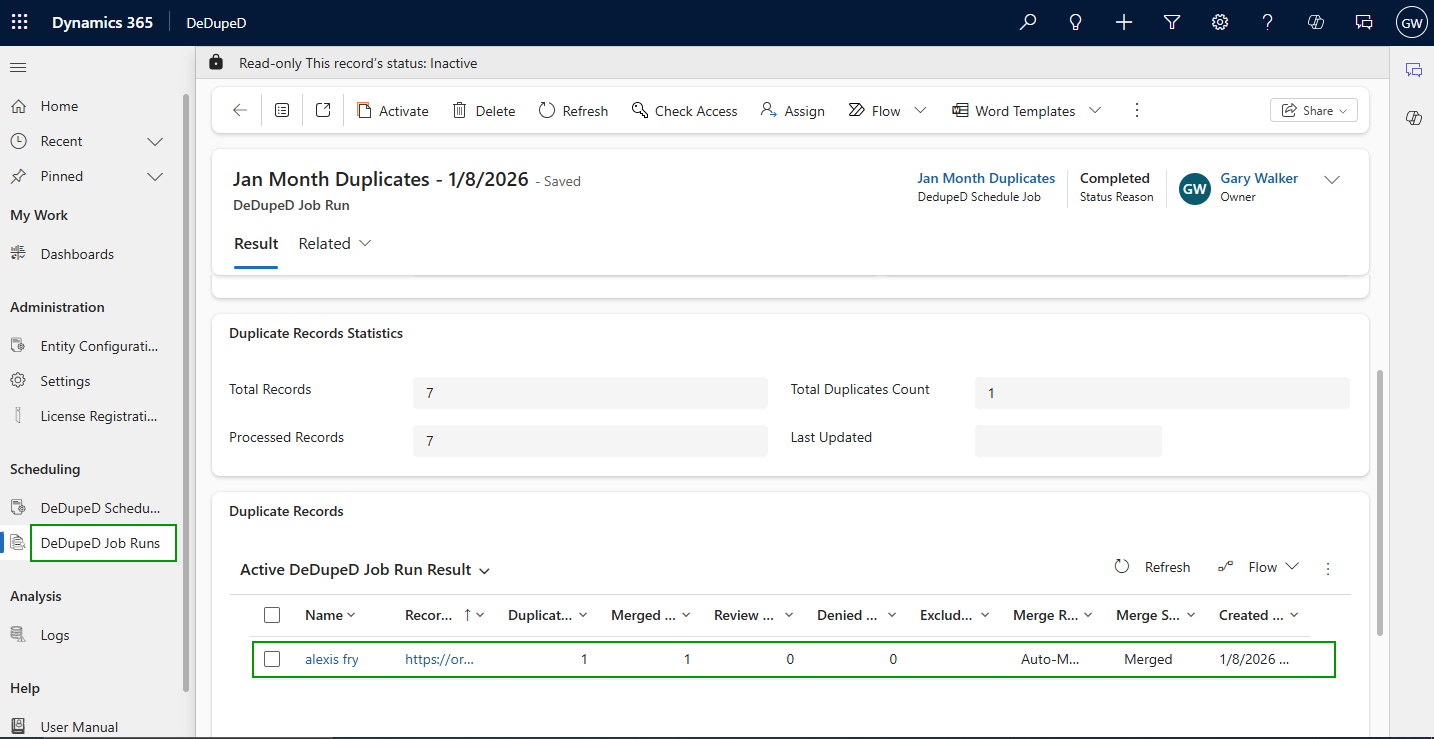 * Scroll down and you’ll find link for the duplicate detection job’s results. Click on this link and it will redirect you to the **‘Duplicate Job Run’** entity.