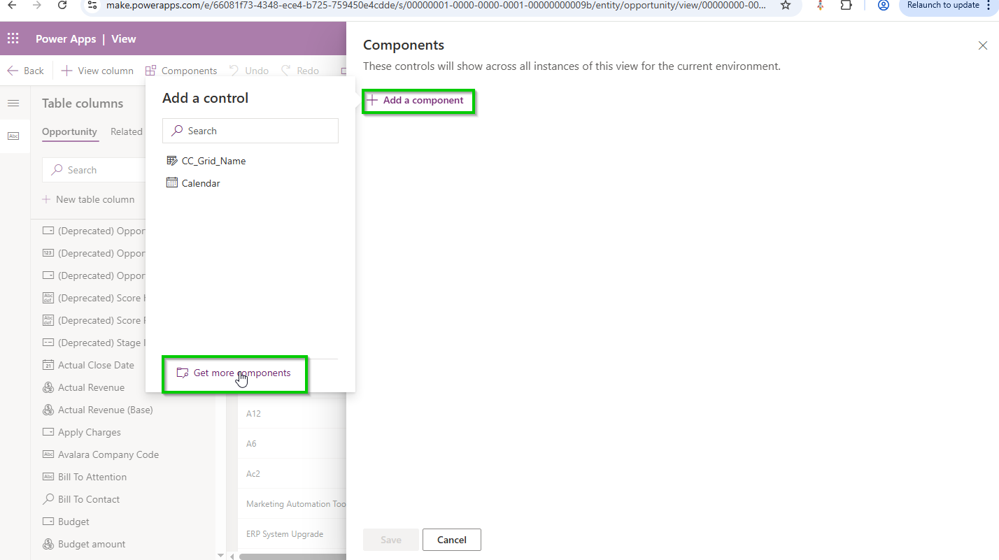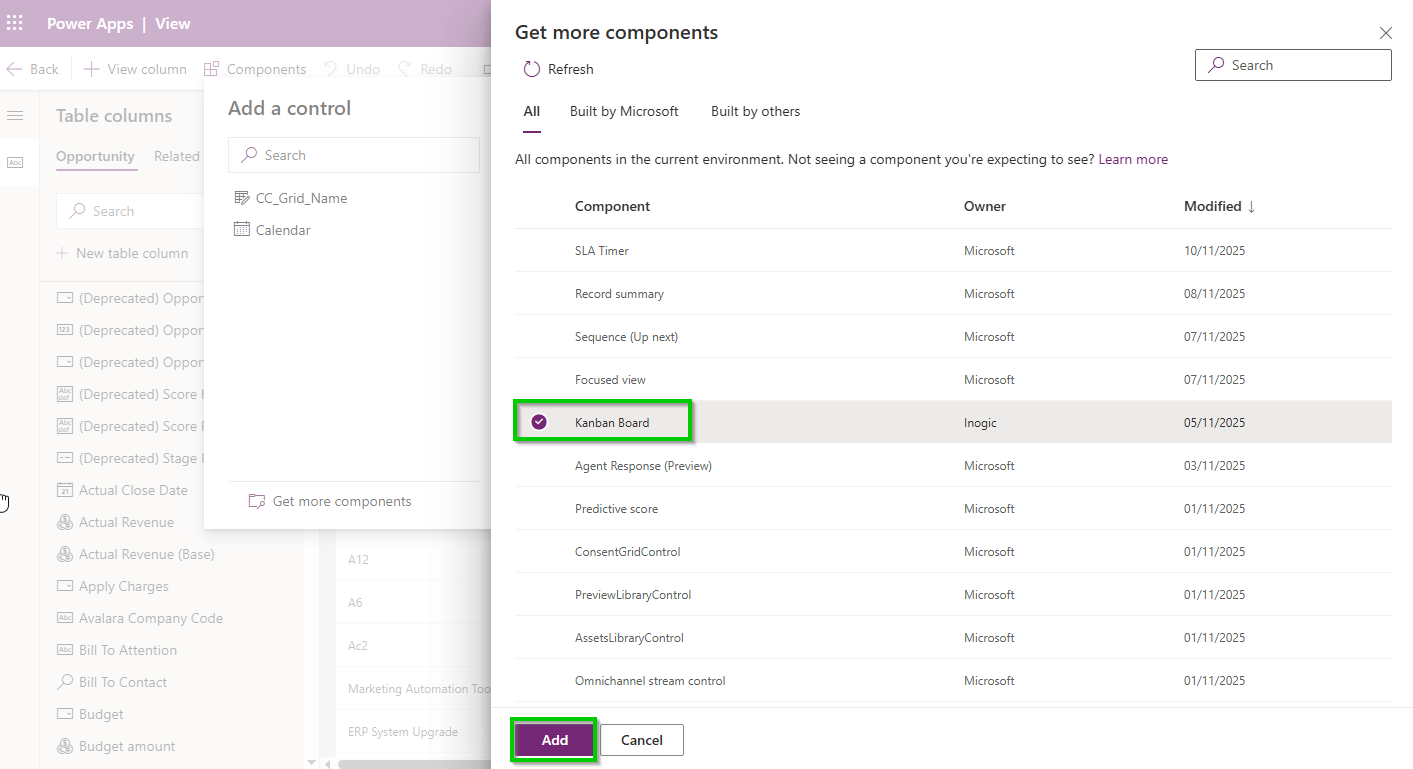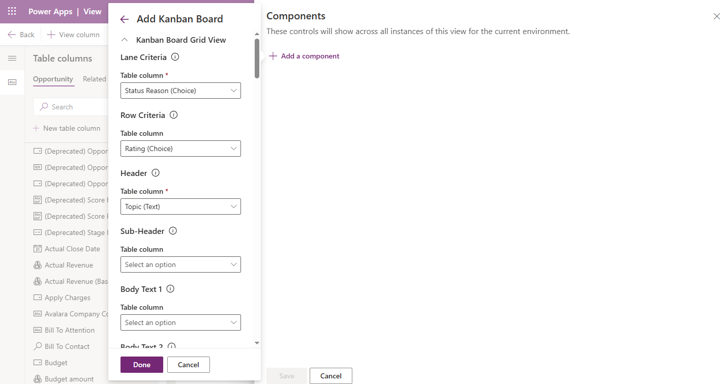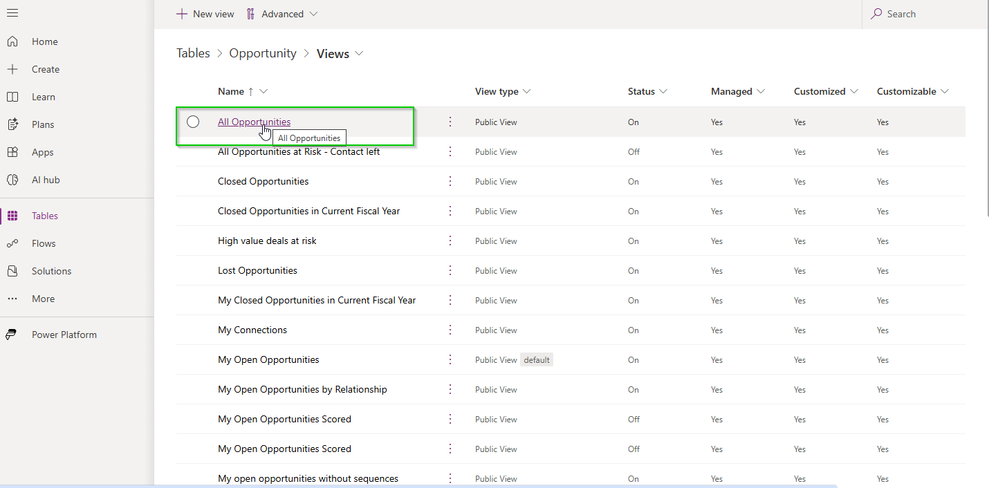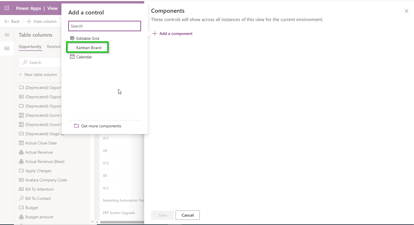 Note: Select the view on which you want to configure the Kanban Board control. In this example, we are using the All Opportunities view.
