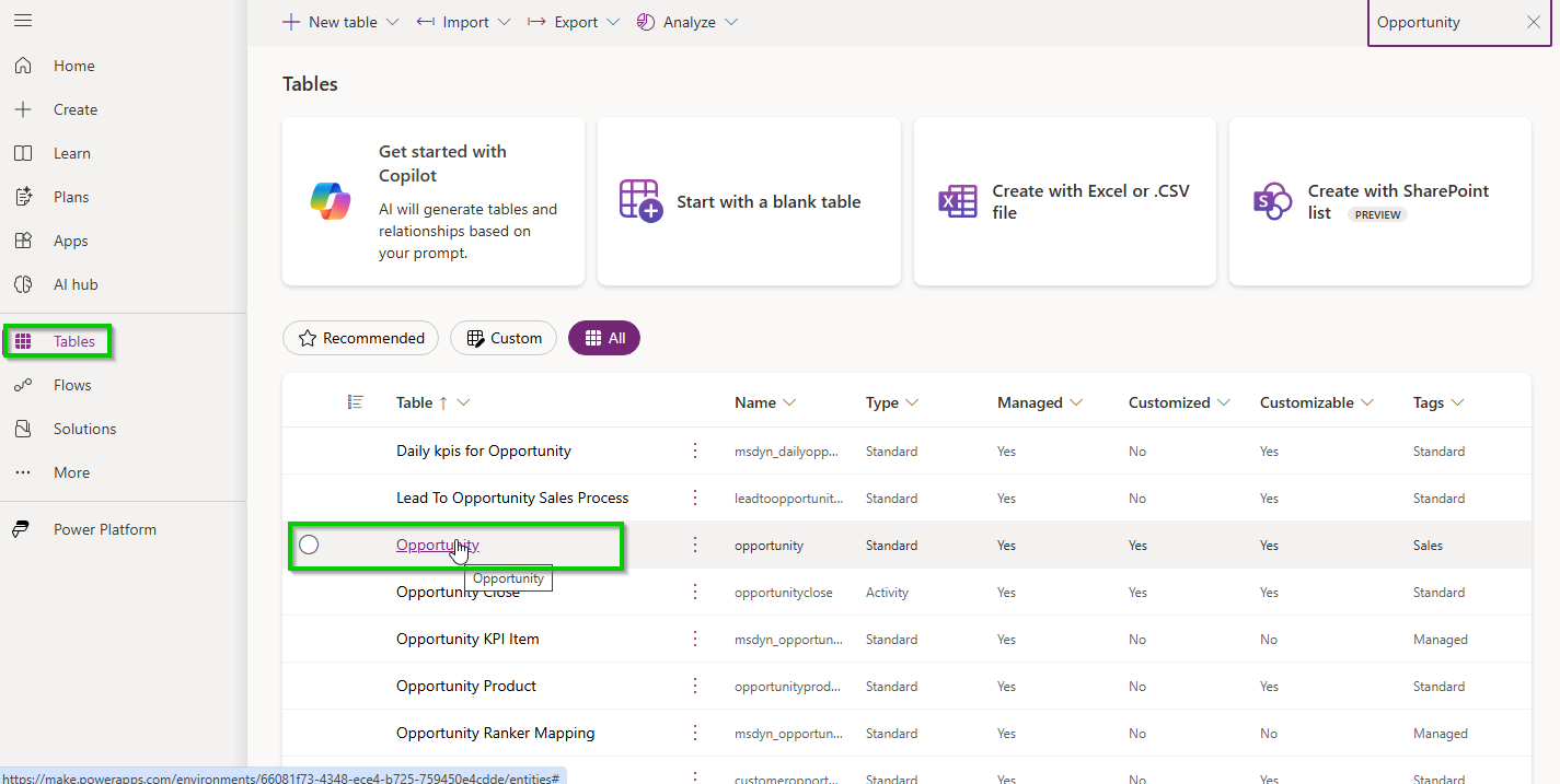 Navigate to make.powerapps.com --> Select the environment --> Tables --> Opportunity