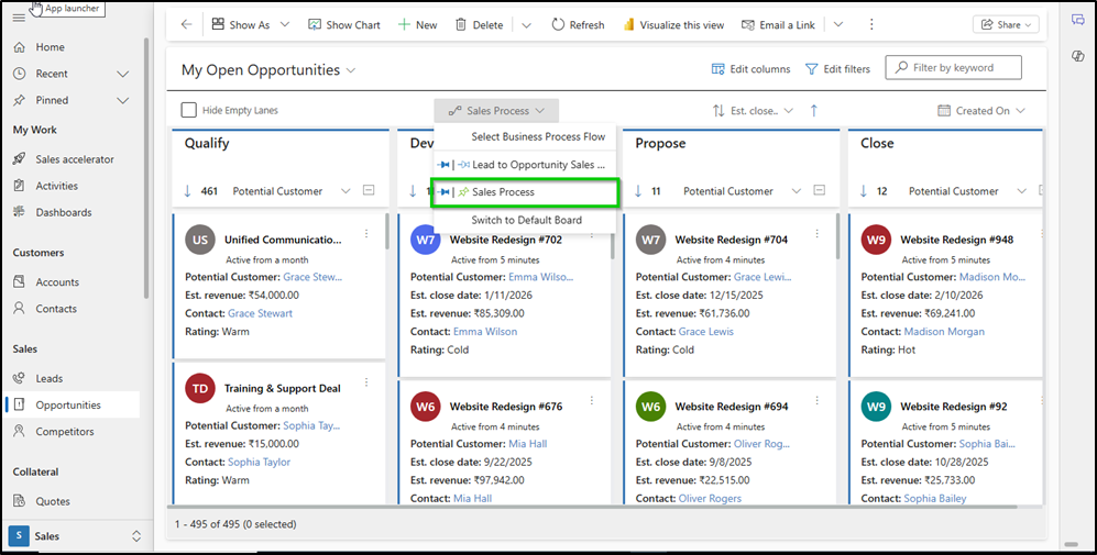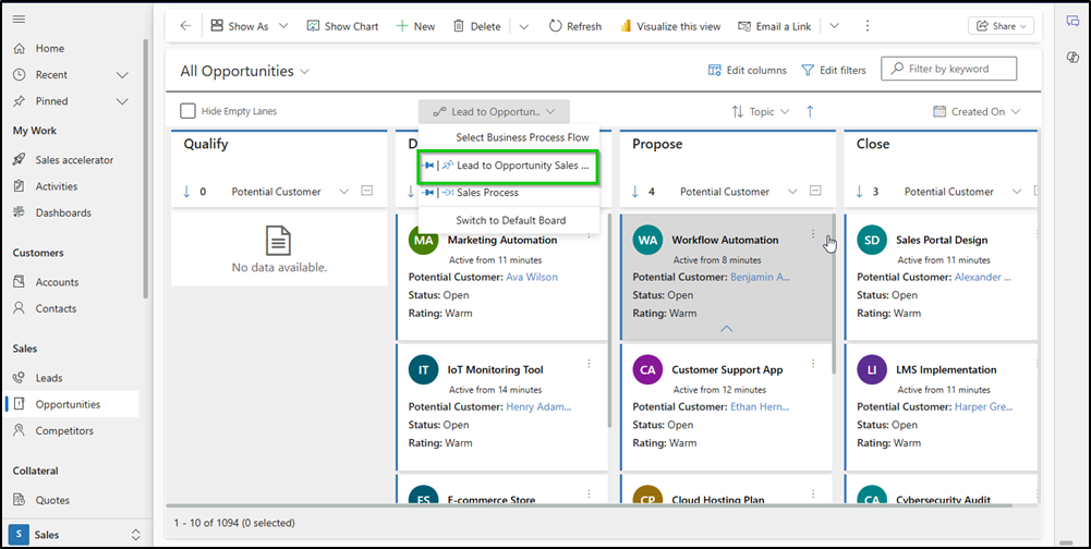 1. Open the Kanban board and the desired view (e.g., *My Open Opportunities*).