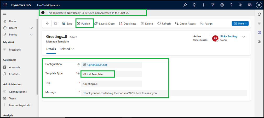 Save the Template: Click the "Save" button to store your new message template. Once you save the message template, make sure to publish in to reflect in the chat UI in both template types.