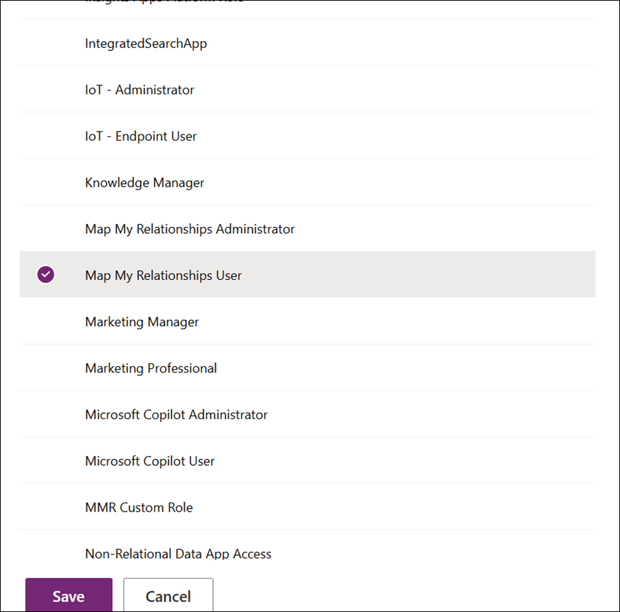 * Click on one of the Map My Relationships security roles --> Click Save.