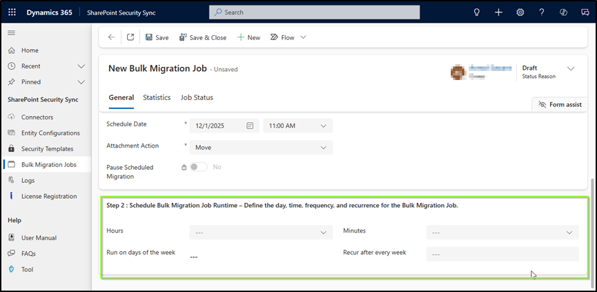 The **Bulk Migration Job (BMJ)** Recurring feature allows SharePoint Security Sync to automatically migrate CRM documents (Emails, Notes, Attachments, etc.) to SharePoint on a fixed repeating schedule, without requiring the user to manually start the migration each time.