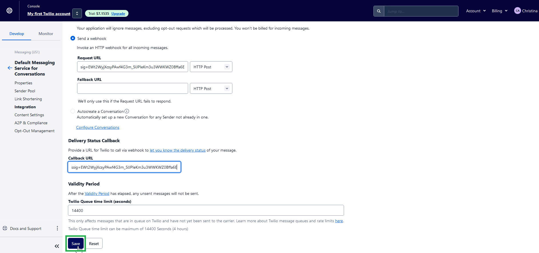 * The copied **Callback URL** will be pasted in the **Default Messaging Service for Conversations** → **Integration section**.