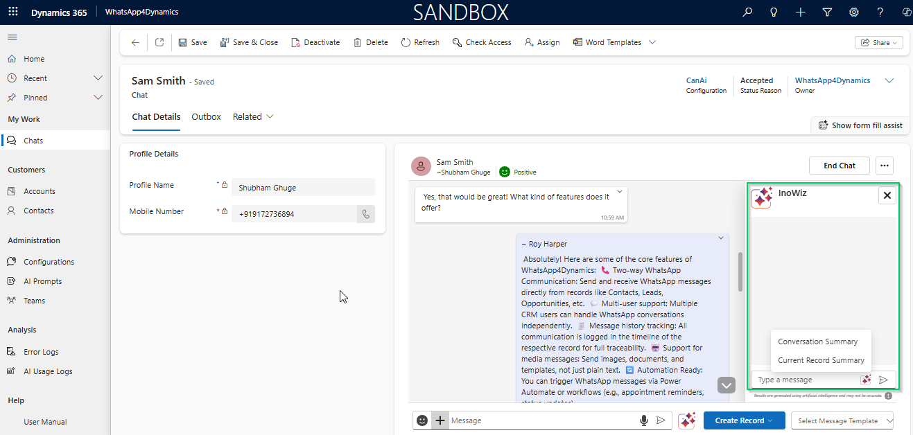 The **AI Chat Panel** in WhatsApp4Dynamics is an integrated, context-aware assistant designed to enhance agent productivity by providing real-time support within the conversation interface.