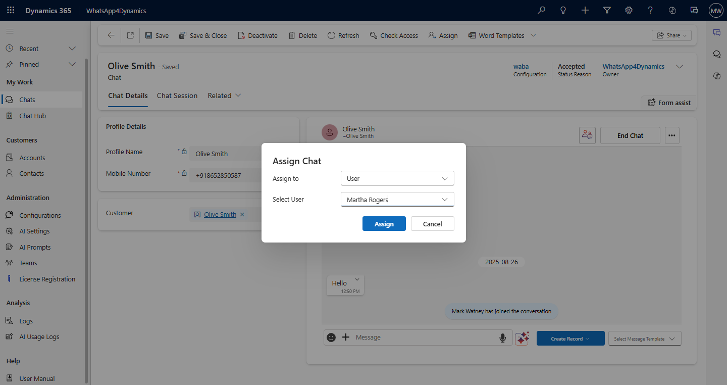 Mark, a sales executive, is chatting with a client but needs to leave for a meeting. He wants his teammate Martha to take over. Using the Assign Chat feature, he assigns the conversation to her in just a few clicks.