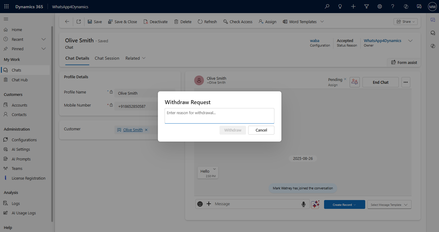 * Upon withdrawal, a popup will appear, prompting Mark to provide a reason for canceling or withdrawing the request (e.g., *No longer needed*, *I resolved it myself*, etc.).