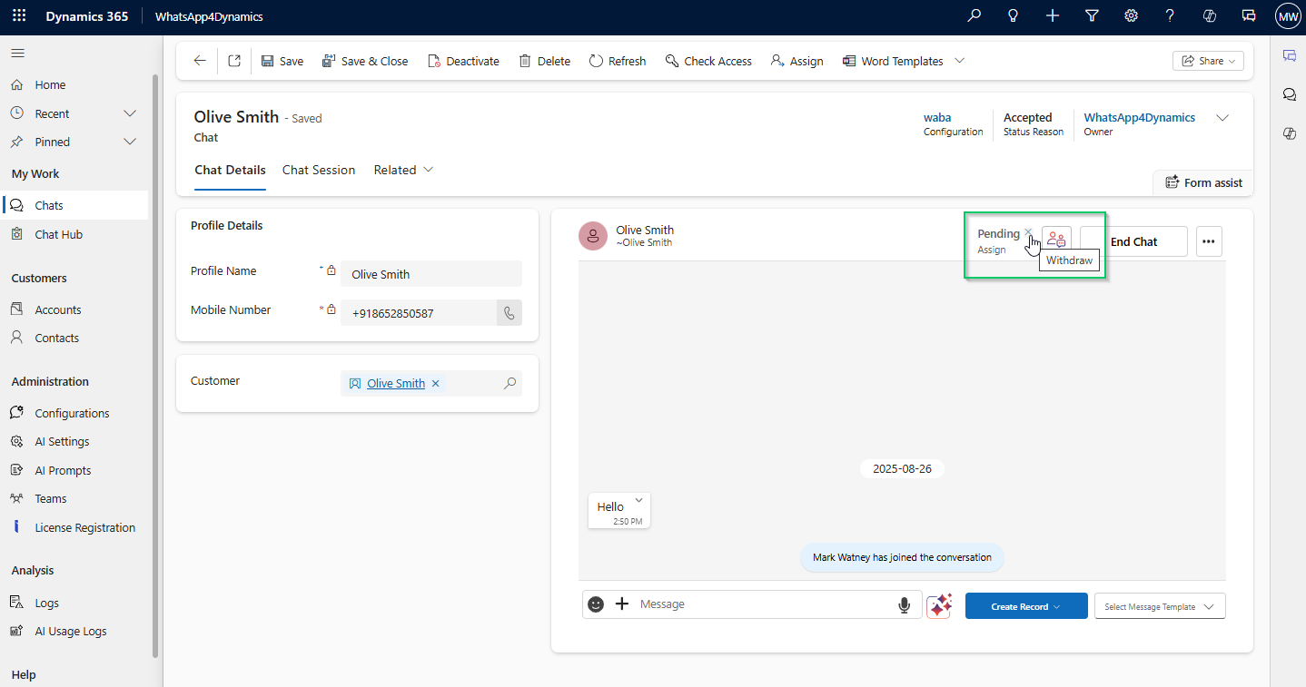 The **Assign Chat** feature allows you to transfer an ongoing WhatsApp chat session to another team member directly within the chat interface. Whether a shift change is happening or specialized support is needed, this tool ensures customer interactions continue without disruption.